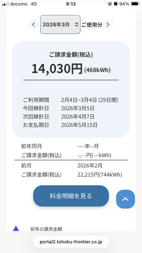 2月初めから3月初めにかけての電気の請求額は14,030円でした。